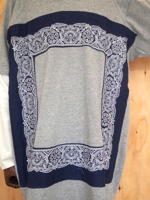 ソフト天竺の柔らかい素材を使用したビッグシルエットのロングTシャツに、USA製のUSEDのバンダナを額縁(ガクブチ)に見立て、バンダナの中を切り抜いてから縫い付けており、全て1点物になります。