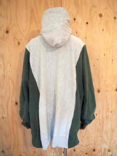 USEDのチャンピオンのリバースウィーブパーカのボディに、同じくチャンピオンのリバースウィーブスウェットのボディと袖を身頃の端で切り替えて付けて、ワイドシルエットになっております。